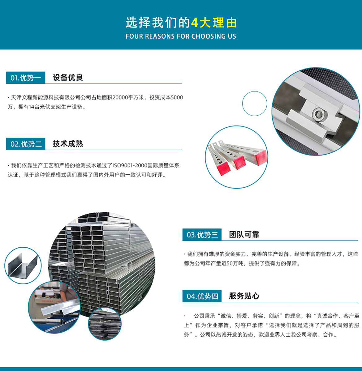 關于我們天津文程新能源科技有限公司成立于2021年,是專注于集中式、分布式、漁光互補和農光互補等清潔能源發(fā)電的綜合性企業(yè) 公司是集設計、研發(fā)、生產(chǎn)、制造為一體的綜合型企業(yè)。公司占地面積20000平方米,注冊資金5000萬元整。公司坐落于華北鋼鐵重鎮(zhèn)--大邱莊,距天津市區(qū)50公里、鄰104和205國道及京滬高速,交通十分便捷。 本公司擁有三個生產(chǎn)車間,其中兩個冷彎型鋼車間,一個鋅鋁鎂型鋼車間,擁有自動冷彎成型機10條,自動數(shù)控沖孔機10條以及焊接加工等設備。主要生產(chǎn)產(chǎn)品有:太陽能光伏支架、各種規(guī)格的C/Z/U型鋼、抗震支架、管廊支架及整套配件等。